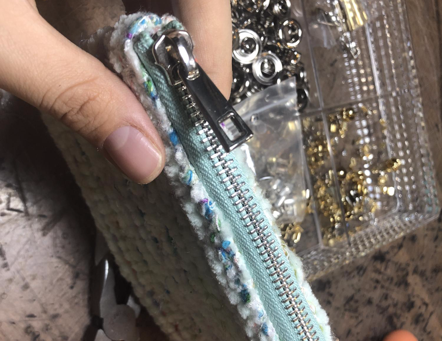 I use to weave minty-pretty fabric in the last practice. I'm now making small pouches with it.